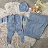 Un set regalo completo e avvolgente, perfetto per dare il benvenuto al nuovo arrivato con calore e dolcezza. Realizzato in morbida maglia blu, questo set offre comfort e stile per i primi giorni del bambino. Include a scelta: