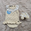 Elegantissimo corredino da 2 pezzi in morbido cotone crema, impreziosito da delicati rombi traforati e pizzo. Un capo unico e raffinato per i primi mesi della tua bimba. Si consiglia una taglia in più, veste piccolo.