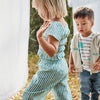 Elegante e confortevole, questo completo a due pezzi è perfetto per le occasioni speciali. La parte superiore, con le spalline arricciate e le maniche a balza, dona un tocco romantico, mentre i pantaloni a righe verticali aggiungono un tocco di freschezza. Realizzato in tessuto leggero e traspirante, ideale per le giornate calde.