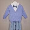 Questo completo da 4 pezzi è l'ideale per celebrazioni speciali come battesimi o matrimoni, unendo la tradizione sartoriale a un tocco di moderna tenerezza. Il set comprende un cardigan azzurro, una camicia bianca classica con lavorazione sul davanti e una salopette in velluto coordinata al papillon, realizzato nello stesso materiale.