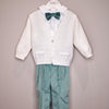 Prepara il tuo piccolo per ogni occasione speciale con questo magnifico completo da 4 pezzi, l'outfit perfetto per cerimonie come battesimi o matrimoni. Comprende un cardigan bianco morbido, caldo e versatile, con scollo a V e chiusura frontale a bottoni. Camicia a maniche lunghe, papillon verde, l'accessorio chiave che dona carattere. Realizzato in velluto morbido per un tocco di ricchezza e un colore di tendenza, e pantaloni in velluto verde, coordinati con il papillon, morbidi al tatto e garantiscono massima libertà di movimento.