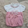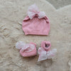 Questo completo include una tutina, una copertina, un bavaglino, un cappellino e scarpine coordinati, realizzati in morbido cotone lavorato a maglia rosa e bianco con dettagli a fiocco. Un set perfetto per i primi giorni della tua bambina. Scegli tra le opzioni gli articoli. Tutto acquistabile singolarmente.