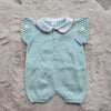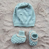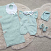 Questo completo include una tutina, una copertina, un bavaglino, un cappellino e scarpine coordinati, realizzati in morbido cotone lavorato a maglia color menta. Un set perfetto per i primi giorni della tua bimba. Possibilità di scegliere un solo elemento e non tutto il completo.