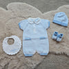 Avvolgi il tuo piccolo in un abbraccio di morbidezza con questo coordinato Marlù! Realizzato in cotone 100% di alta qualità, questo set è perfetto per i primi giorni del tuo bambino. Il pagliaccetto, con la sua chiusura a bottoni e i dettagli a contrasto, garantisce comfort e praticità, mentre il bavaglino, il cappellino e le scarpine completano il look con un tocco di tenerezza e un'elegante lavorazione a maglia.
