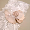 Il nastro è realizzato in pizzo bianco morbido e traforato con motivi floreali. L'elemento centrale è un fiore tridimensionale composto da petali in tessuto color beige chiaro/tortora, disposti a strati per creare volume, al centro del quale spicca un bottone rivestito in maglia nella stessa tonalità, che conferisce una texture unica. Il fiore è ulteriormente impreziosito da un sottile strato di tulle a rete bianco con piccoli pois in rilievo. Questa fascetta, con la sua combinazione di pizzo e dettagli floreali, è perfetta per coordinarsi con abiti da battesimo, vestiti da festa o come dolce ornamento per i capelli delle più piccole.