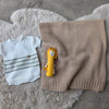 - Una calda copertina in maglia di cotone organico: Una soffice e avvolgente copertina in maglia color sabbia, perfetta per coccolare il bambino durante la nanna o le passeggiate. La lavorazione a coste sui bordi dona un tocco di eleganza e garantisce una maggiore durata.