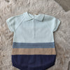 Un capo raffinato e confortevole per vestire il tuo piccolo con un tocco di stile anche nelle giornate più calde. Questa elegante tutina in maglia a maniche corte presenta un design a blocchi di colore ispirato al mondo nautico: una delicata tonalità celeste sulla parte superiore, seguita da una fascia azzurro polvere con una raffinata lavorazione a piccoli rombi, un caldo color sabbia e un profondo blu navy nella parte inferiore.