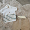 - Una polo a maniche corte: Realizzata in morbida maglia bianca con un elegante motivo a righe orizzontali nei toni del verde salvia e del beige nella parte inferiore. Presenta un classico colletto, un piccolo taschino sul petto e una chiusura con bottoni in legno sul davanti, aggiungendo un tocco di raffinatezza.