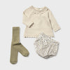 Mayoral Newborn Set 3 pezzi. Completo per neonata in maglia. Maglione color avena con colletto e polsini rifiniti con un volant in pizzo. Culotte con elastico in vita e sulle cosce, fantasia floreale su sfondo bianco. Calzamaglia abbinata color verde.