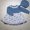 Questo adorabile completo Juliana a quattro pezzi è l'ideale per vestire la tua bambina con stile e comfort. Il set unisce la lavorazione a maglia in azzurro con una stampa a tema boschivo, che presenta simpatici orsetti e alberi.