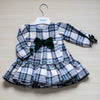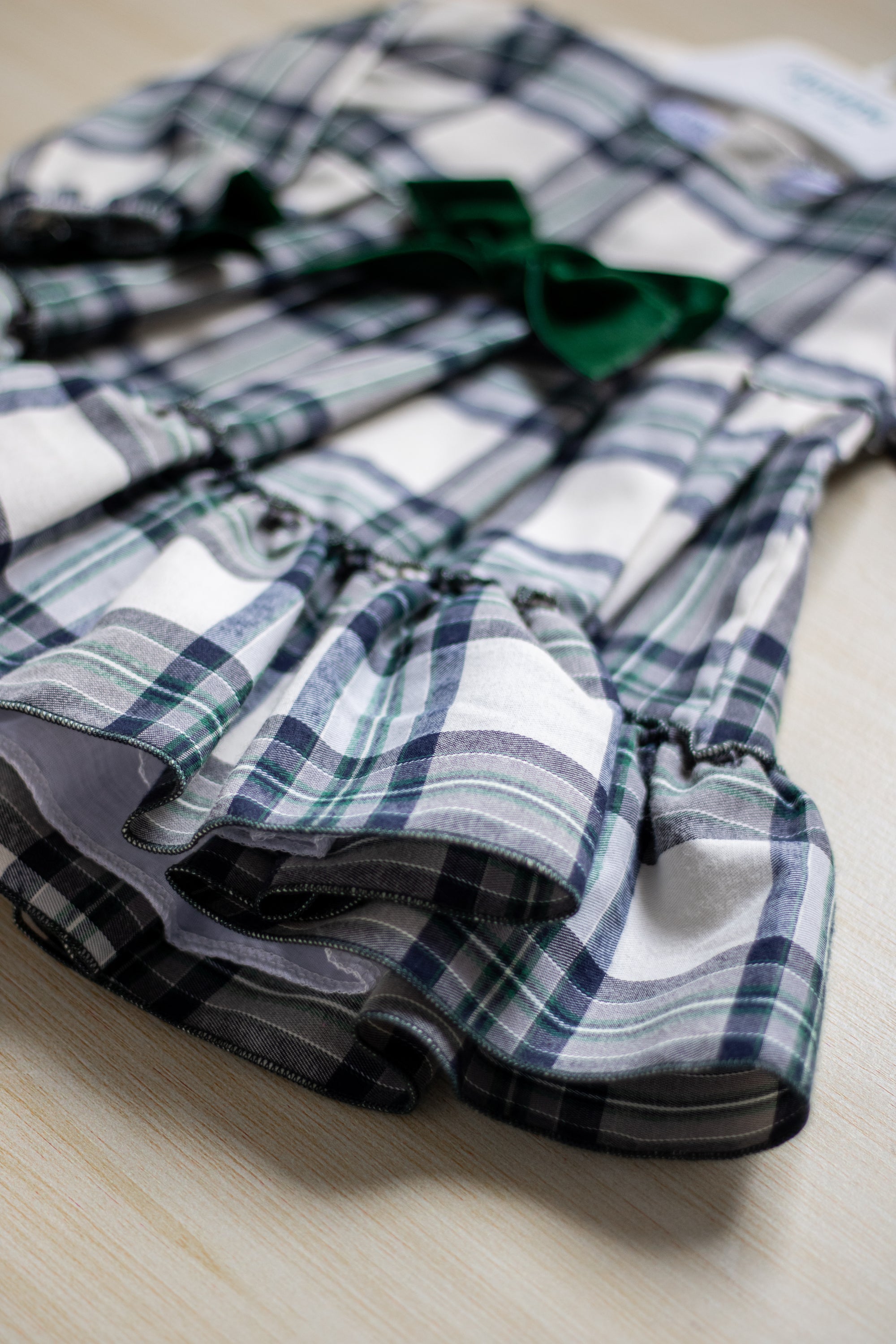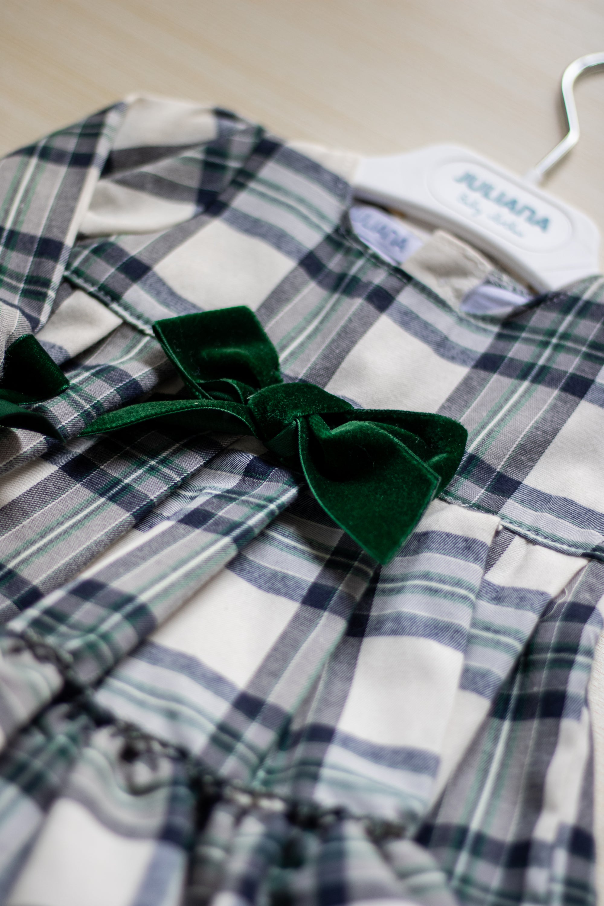Questo abitino Juliana è interamente realizzato in una ricca fantasia scozzese, dominata dai colori bianco panna, verde bosco e blu navy/grigio. La silhouette è svasata e giocosa, grazie alla gonna che si apre con morbide pieghe dal punto vita.