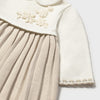 Questo elegante vestitino in tricot di Mayoral è l'ideale per le occasioni speciali della tua bambina. Il capo presenta un design raffinato con due sezioni di colore. La parte superiore, in tessuto a maglia di colore panna, è impreziosita da tre applicazioni floreali tridimensionali. Sotto un'arricciatura, la gonna si sviluppa con un'elegante lavorazione a costine verticali di colore beige, che conferisce un look plissettato.